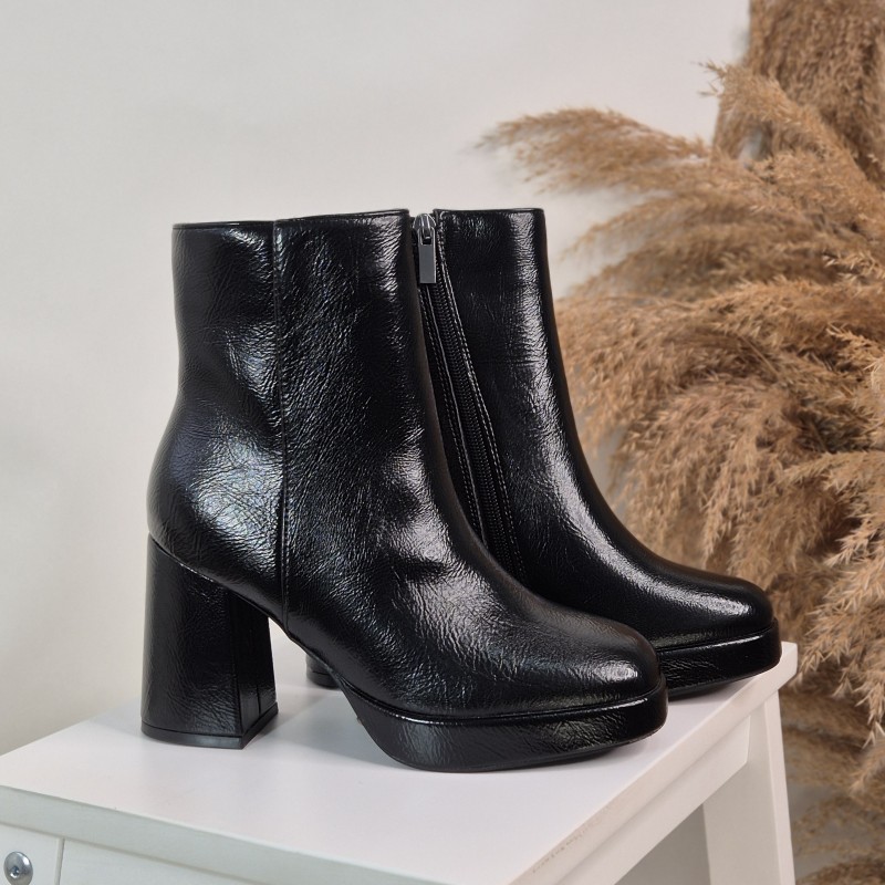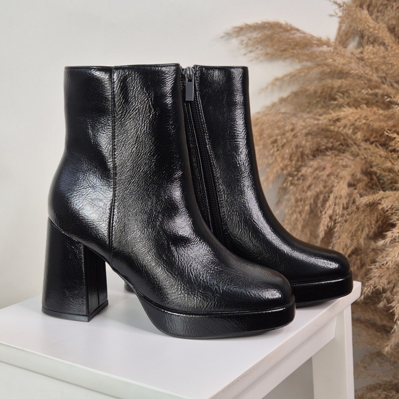 Botín en material sintético , 8,5 cm altura de tacón  y 2 cm de plataforma .