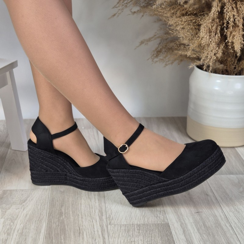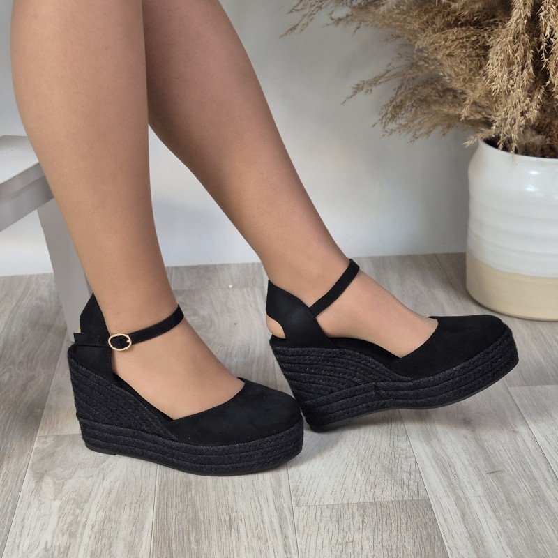 Cuñas en antelina con suela de esparto , 10cm altura de tacón y 3 cm de plataforma .