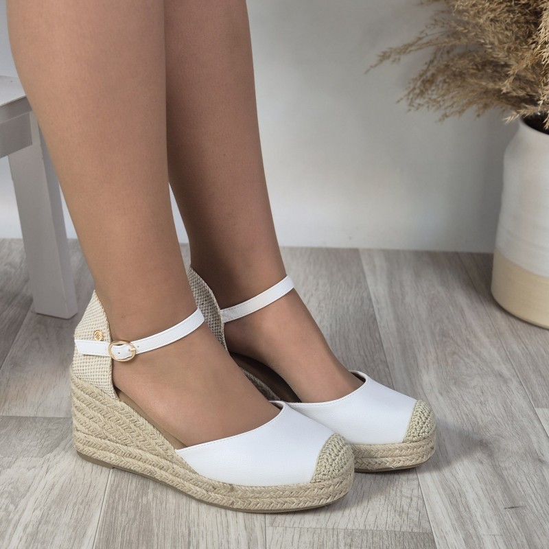 Cuñas con suela de esparto en material sintético , 8 cm altura de tacón y 2 cm de plataforma .