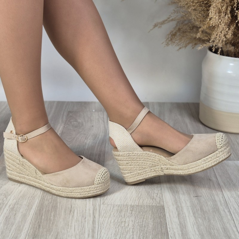 Cuñas con suela de esparto en antelina , 8 cm altura de tacón y 2 cm de plataforma .