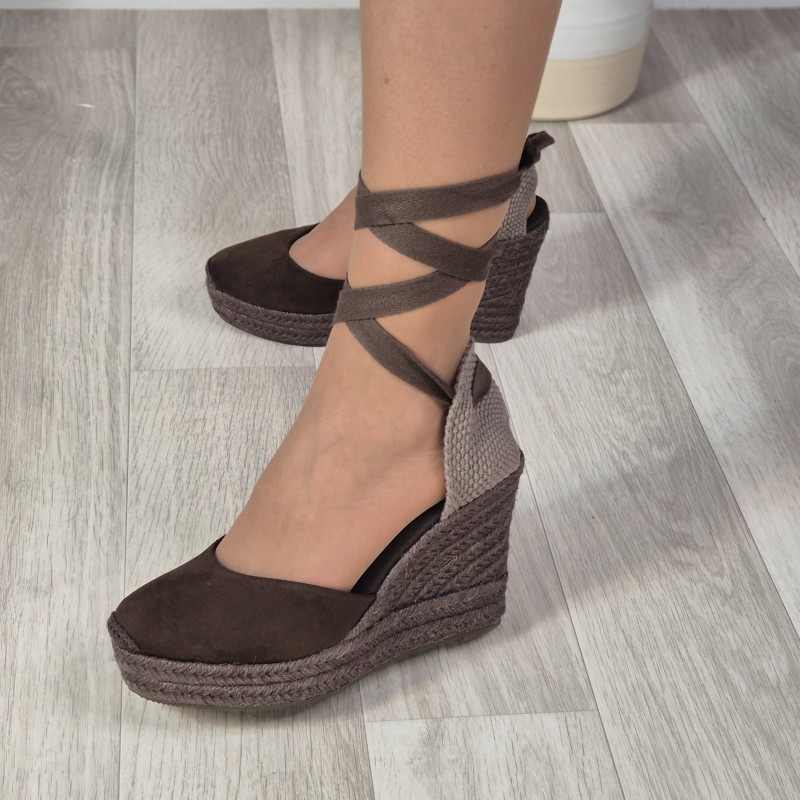 Cuñas en antelina con suela de esparto , 10 cm altura de tacón y 2,5 cm de plataforma . (CORINA)