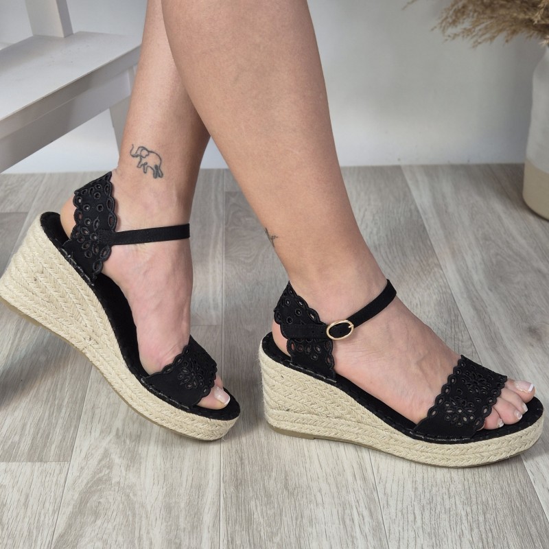 Cuñas en antelina con suela de esparto , 7,5 cm altura de tacón y 2 cm altura de plataforma .