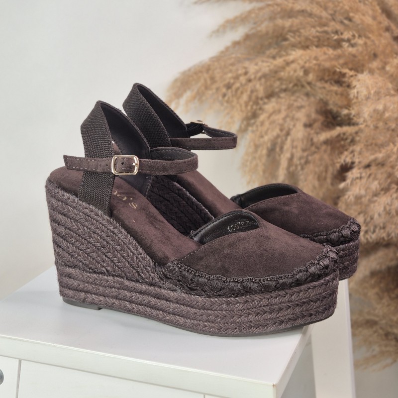Cuñas en antelina con suela de esparto , 10cm altura de tacón y 3cm altura de plataforma .